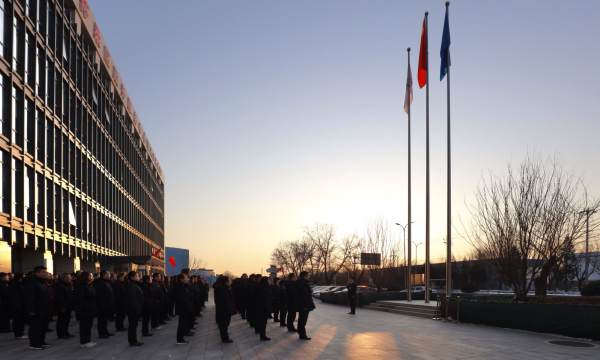 8点08分,迎着新一年的曙光仪式正式开始,在庄严的国歌声中,升旗手高高扬起国旗,鲜艳的五星红旗迎风招展,冉冉升起。天气虽然寒冷,但也挡不住中航建设人的热情,大家精神抖擞、庄严肃立,面向五星红旗和司旗行注目礼。